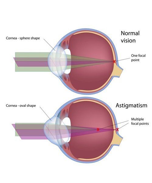 Astigmatism is a common condition that causes blurred or distorted vision, it occurs when the cornea or lens isn’t perfectly curved shape. Astigmatism is the optical term for more than one point of focus. The cornea should be regularly curved like a football but if you have an astigmatism it has an irregular curve more like a rugby ball, therefore the light that enters the eye isn’t focusing properly creating a blurred image.